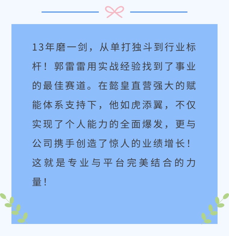 在此,我們也想對在外奮斗的家人們說,如果你們也面臨與郭雷雷相似的困擾,那么擁有 20 年深厚底蘊(yùn)、成熟企業(yè)文化與強(qiáng)大支撐賦能體系的懿皇地產(chǎn),定能為你排憂解難,成為你事業(yè)騰飛的堅實(shí)后盾!
